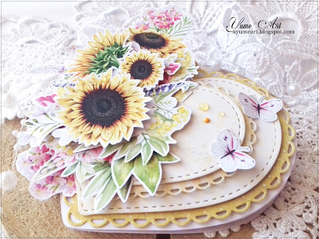It's rather delicate wedding card. I used yellow here but I hope it is not too vivid since I tried to use light colours of "Bananarama" papers by UHK Gallery.