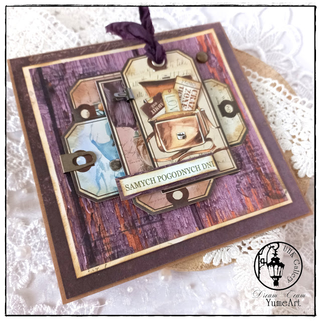 I'd like to show you a card that I made some time ago for our boss, Ula. It' was made for her birthday. I used "Nostalgic girl" paper collection. I used some metal embelishments, some ribbon and... a few other embelishments in the bag. i used a sharp knofe and carefully cut the line in a place where I could pretend that some other tickets are seen in the bag.